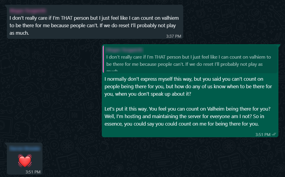 A week later, I reached out to her privately. At first, the conversation seemed normal, at least on the surface, even though I still couldn’t reconcile her reaction to something as minor as resetting the server.