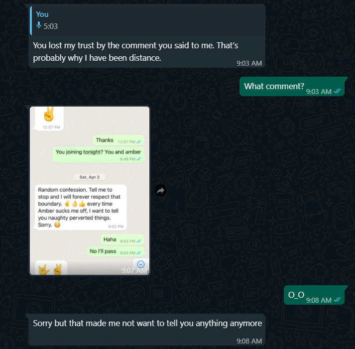 It was around the end of 2021 that Magnolia and I started speaking more and more. She opened up about everything like gaming, her siblings, her job and career, her relationships, and eventually, her views on sex. We did talk about sex occasionally, but it wasn’t flirtatious. It was more about sharing perspectives. At one point, she even described herself as a “very nasty girl” in a voice message.